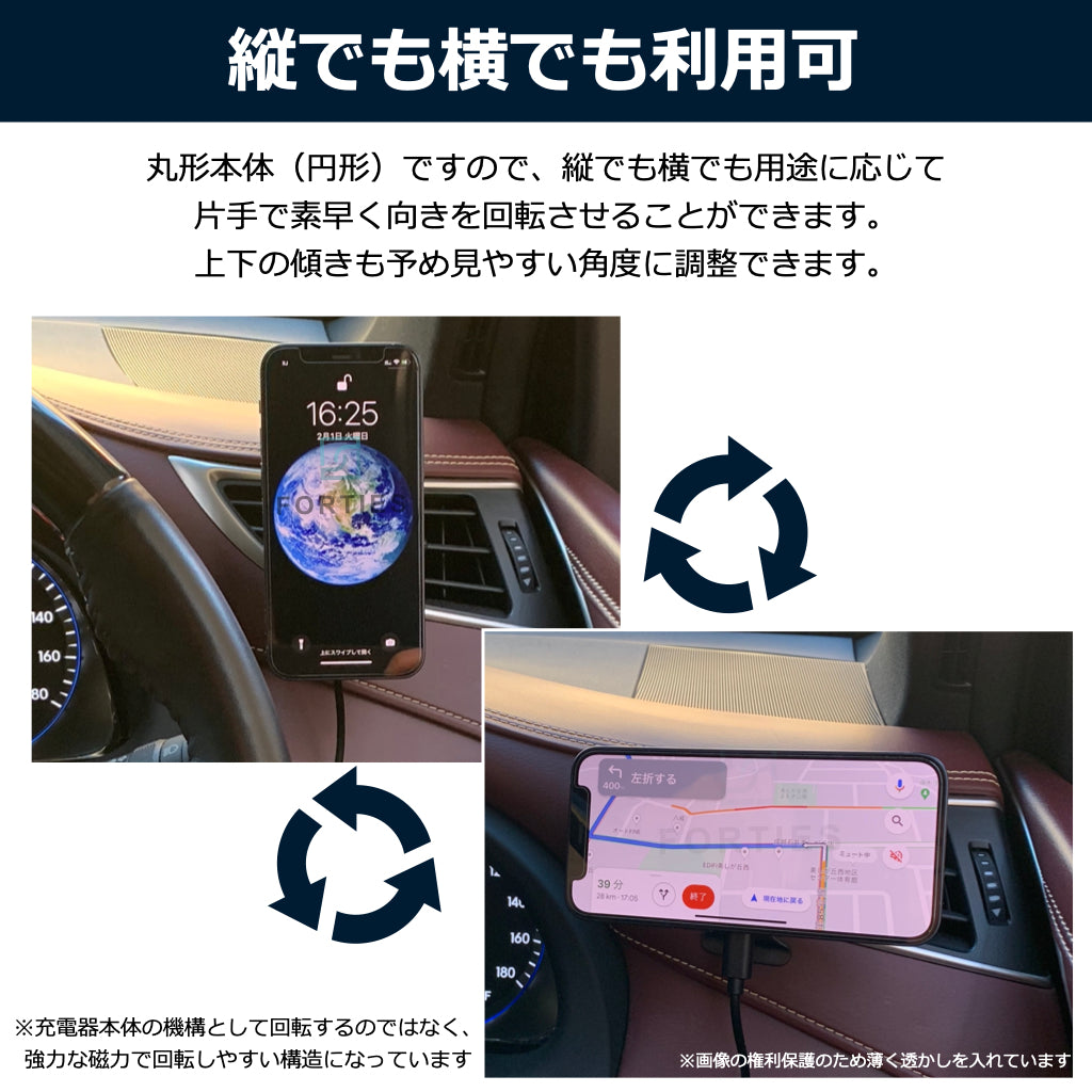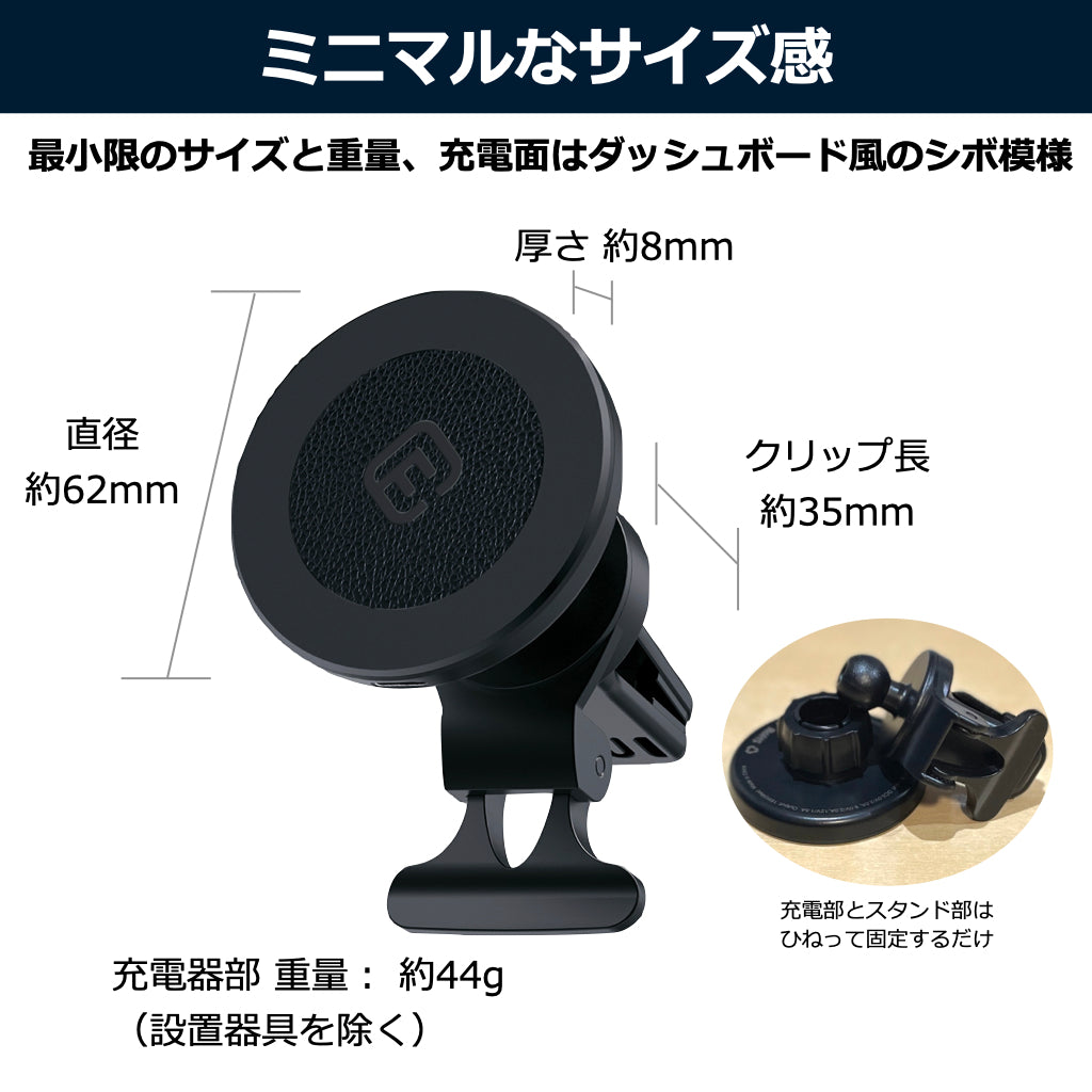 - 軽量ミニマルなデザイン: 本体は必要最小限の大きさ、直径約6cmで約44gといったコンパクトなサイズです。円形の形状で強力な磁石を搭載していますので、縦でも横でも利用可能。信号待ちなどの間に片手で簡単に向きを変更できます。通話やメールの連絡待ちは縦で利用、マップアプリのカーナビ利用は横で利用するなど、用途に合わせてご利用いただけます。